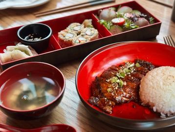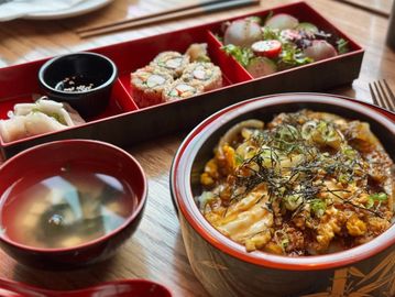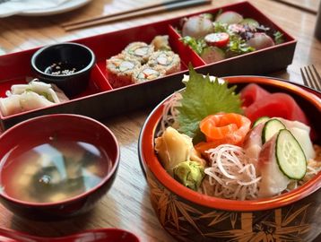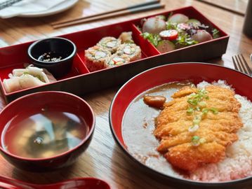 ALL MEAL SERVES W/ MISO SOUP, 2PCS CHICKEN GYOZA STEAMED, HOUSE SALAD, AND HALF-ROLL CALIFORNIA